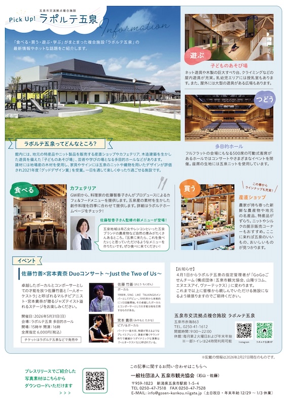 「食べる・買う・遊ぶ・学ぶ」がそろう五泉市交流拠点複合施設「ラポルテ五泉」の最新情報も紹介。