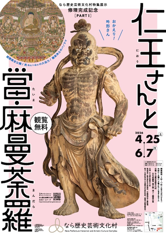 第Ⅰ期は「ミツバチの仁王さん」として親しまれる當麻寺金剛力士像のうちの吽形像と、5ヶ年にわたる修理が完了した當麻曼荼羅図(當麻寺奥院所蔵)の修理完成記念展です。修理の内容や新知見を詳しくご紹介するとともに、曼荼羅信仰の広がりと仁王門の歴史について、関連資料とともにひもときます。
