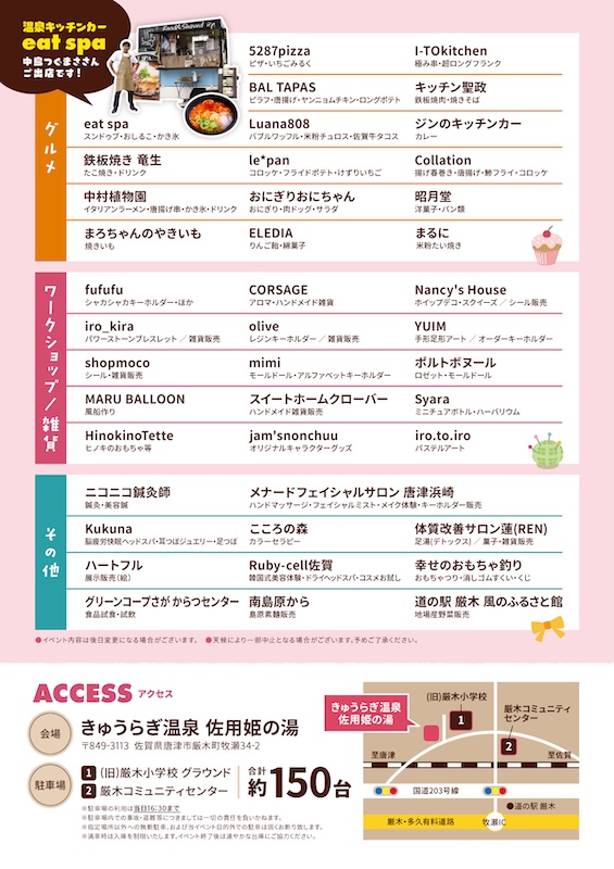 会場となる佐用姫の湯の駐車場や大広間には、地元佐賀で活動しているキッチンカーやハンドメイド雑貨、体験型ワークショップなどが並びます。