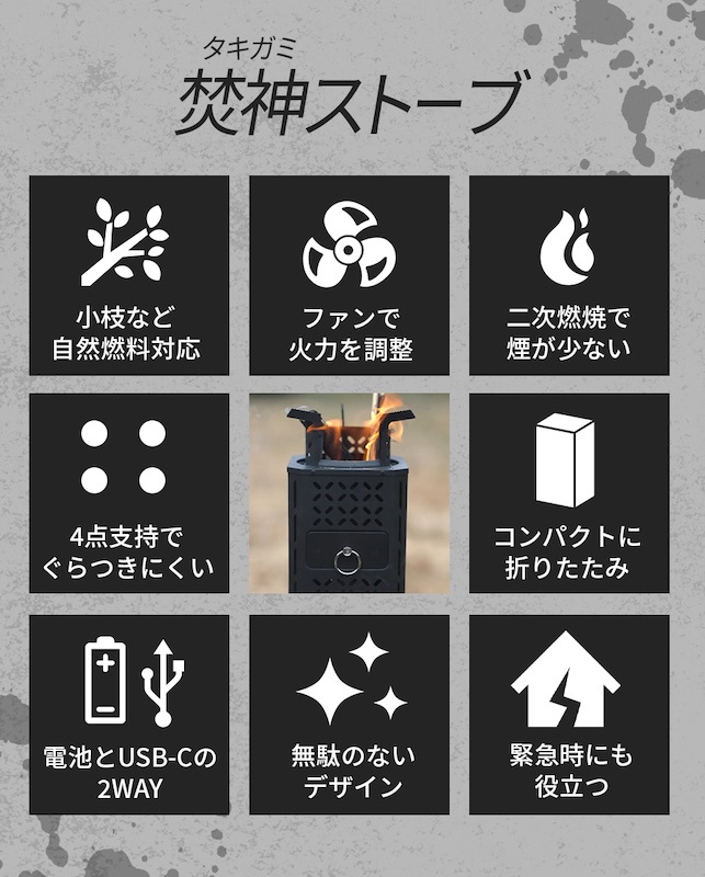 燃料は小枝や落ち葉などキャンプ場で手に入る自然のバイオマス燃料に対応。