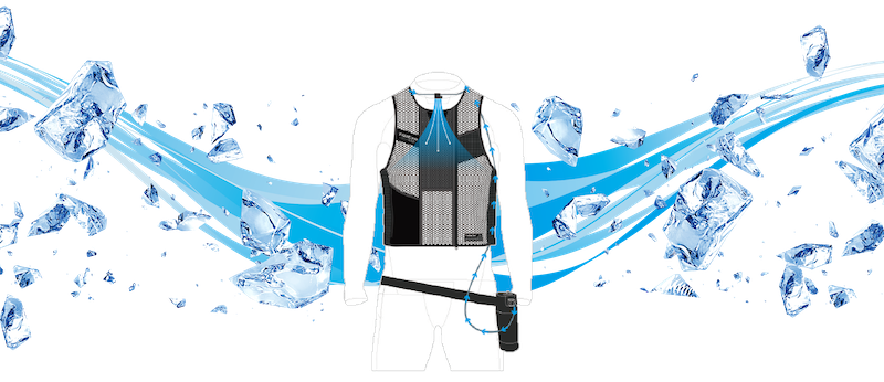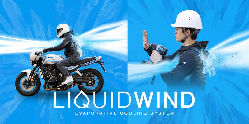 LIQUIDWINDは、腰に装着した電動ボトルから専用冷却水をアンダーウエアへ送水し、走行風の力で気化冷却を起こして胸部と背中を集中冷却するシステムです。冷却水「LIQUIDWIND WATER」は化粧品メーカー・株式会社マンダムと当社の共同開発による専用品で、気化冷却時に爽快感を伴わせ、冷却システムとしての性能を最大化する設計となっています。