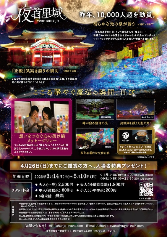 2026年3月14日(土)から5月10日(日)までの期間、夜首里城実行委員会は、首里城公園にて夜間特別イベント「夜首里城 YORUSHURIJO」を開催いたします。本イベントは、夜の首里城をライトアップやプロジェクションマッピングなどの光で彩る