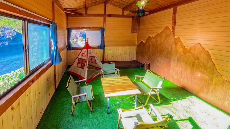 室内にはキッズテントやローチェア、ローテーブル、カセットコンロを設置。お部屋の中でもキャンプ気分を楽しめる特別な空間になっており、室外には温水シンクや焚き火台がついています。