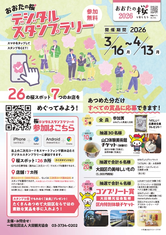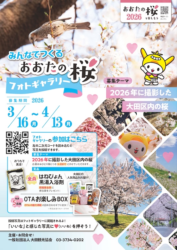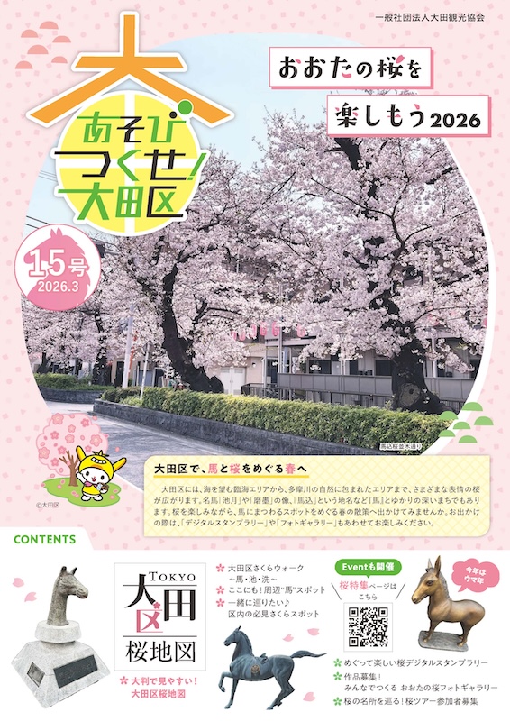 一般社団法人大田観光協会は、今年も「おおたの桜を楽しもう2026」を開催します。区内各所の桜スポットを巡るデジタルスタンプラリーや写真投稿企画など、春を満喫できる多彩なイベントで、おおたの魅力を再発見してください。