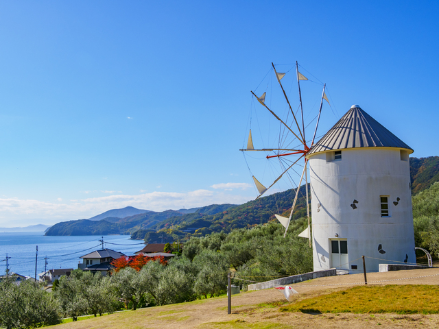 実写版映画『魔女の宅急便』のロケセットを活かしたフォトスポットの聖地として知られる道の駅 小豆島オリーブ公園。園内にはギリシャ風車をはじめ、物語の世界観を思わせる風景が広がり、まるで映画のワンシーンに入り込んだかのような体験が楽しめます。