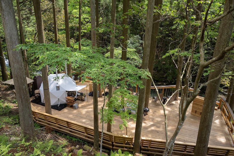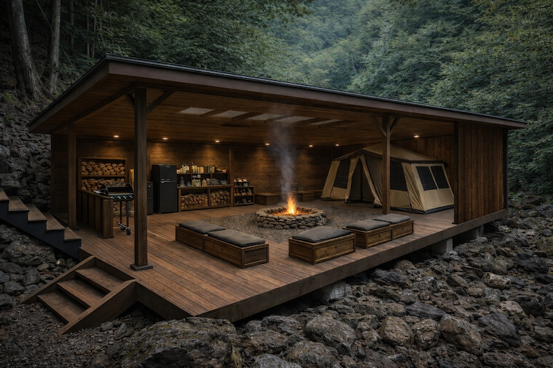 第一テラスと階段でつながり、天候にとらわれず、サウナ・川・焚き火・食・夜の時間がゆるやかに循環する場所となります。