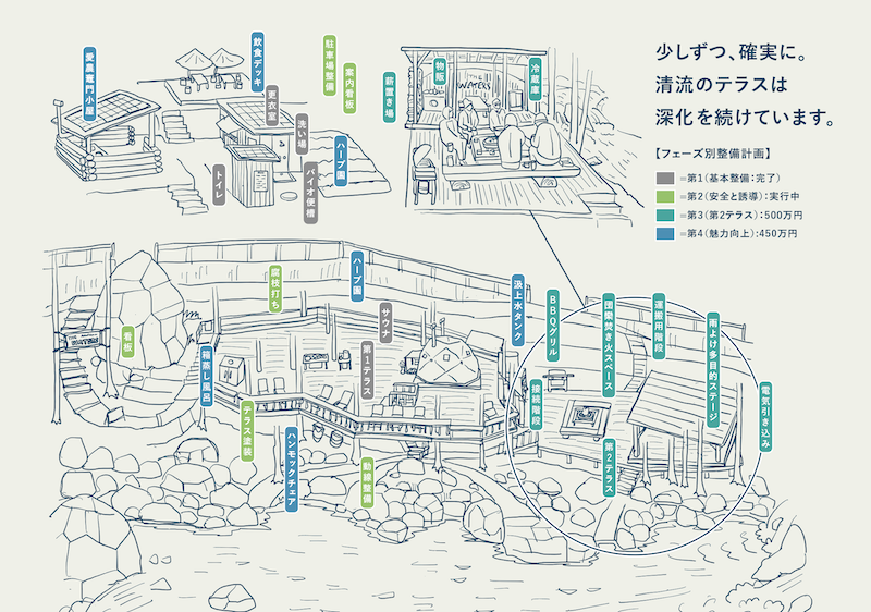 2025年に実施した第一章のクラウドファンディングでは、多くの支援者の協力により川辺のサウナテラスを整備。