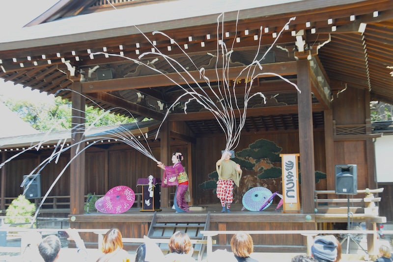 3月29日(日)正午、境内能楽堂では寄席などで披露される伝統芸能が、(公社)落語芸術協会により奉納されます。今回の奉納演目は「落語」と「太神楽曲芸」。観覧は無料です。