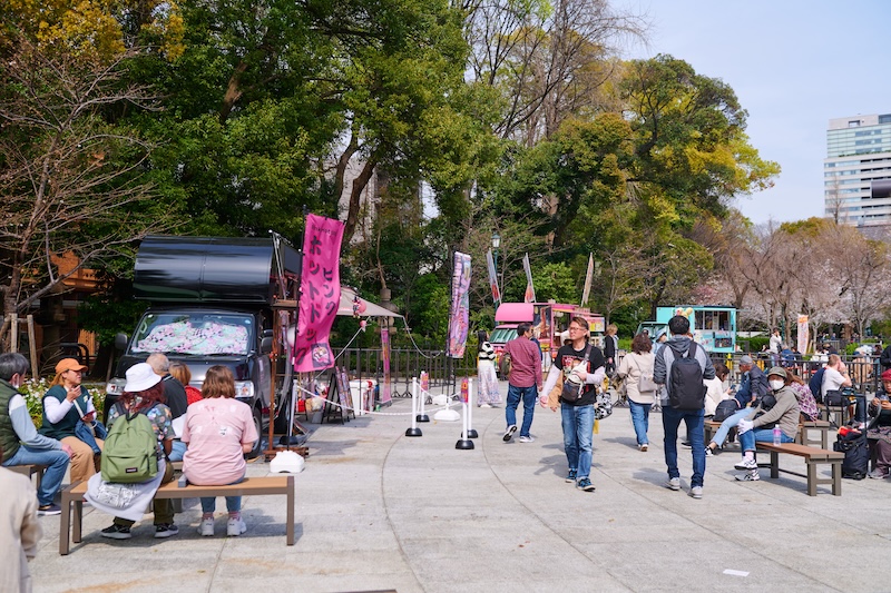 外苑憩いの庭では期間限定でキッチンカーの出店があるので、軽食を楽しみながらゆっくり桜を眺めることができます。