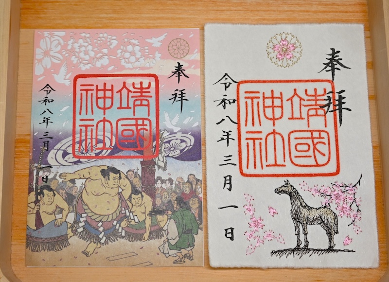 奉納大相撲と、戦争で亡くなった軍馬の慰霊像をモチーフにして、桜があしらわれています。