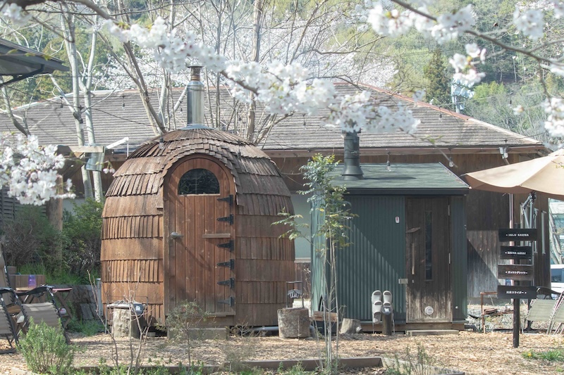 コモリバ自慢の薪で温めるプライベートサウナでは、外気浴の際、目の前に桜を望むことができます。サウナに入り、清流でクールダウン。桜に囲まれた幻想的な空間でのととのいは格別です。
