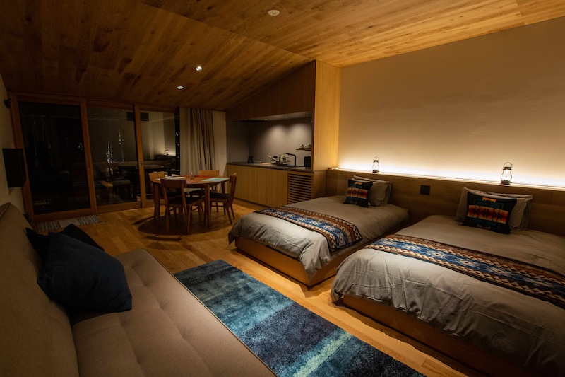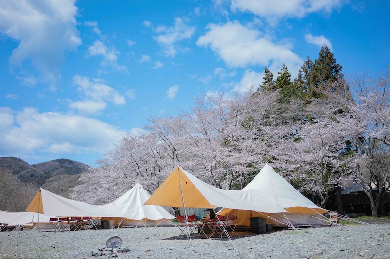 ホテルのような「キャビンルーム」、気軽にテントステイを楽しめる「グランピングテント」の2タイプの客室があります。キャビンルームにはデッキがついていて、桜を見ながらのお食事が可能です。桜の見えるデッキで飲むコーヒーは格別です。