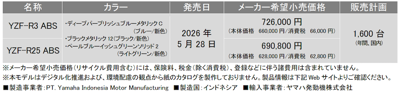 ヤマハ発動機販売株式会社は、スーパースポーツ「YZF-R3 ABS」、「YZF-R25 ABS」のカラーリング3色を刷新し、5月28日に発売します。台数限定にて2月27日より発売の「70th Anniversary Edition」(ホワイト)とあわせ4色展開となります。