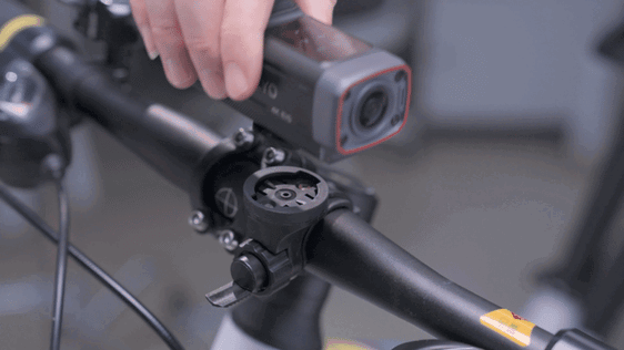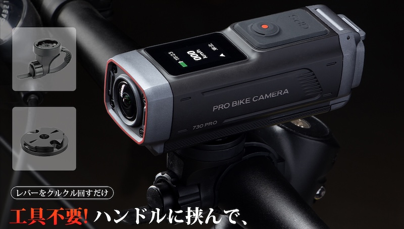 マグネットレールマウント・レバー式クイックマウント・バックミラーマウントの3種を標準付属。約1秒での着脱が可能で、自転車・バイクどちらにも対応します。防盗ネジが付属しており、盗難防止や急ブレーキ時の脱落防止にも対応しています。また底面の1/4インチ汎用ネジ穴により、市販のアクションカメラ用ブラケットとの互換性も備えています。