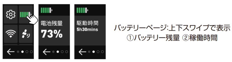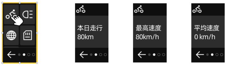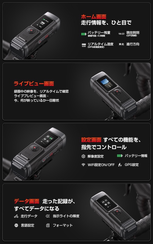 スワイプ操作対応のディスプレイをカメラ本体に搭載。Wi-Fi・GPS・解像度などの設定をスマートフォンアプリを開かずにその場で変更できます。GPS連動によるリアルタイム速度・進行方向表示にも対応しています。