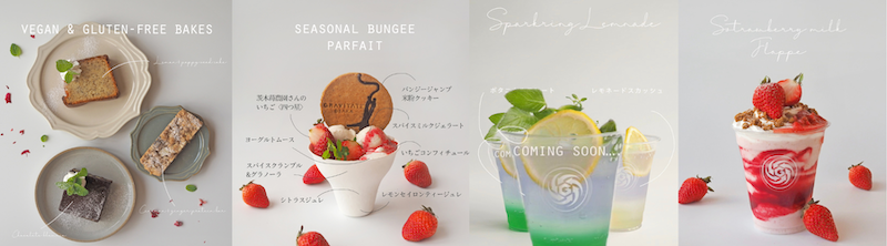 420 STOREでは地元茨木の農家から仕入れた甘い苺を使った「苺ミルクフラッペ」やバンジージャンプが描かれたクッキーをのせた「いちごとスパイスのジンジャーパフェ」、そして、爽やかな酸味が特徴の「レモネードスカッシュ」やビーガン&グルテンフリーの焼き菓子をご用意しています。