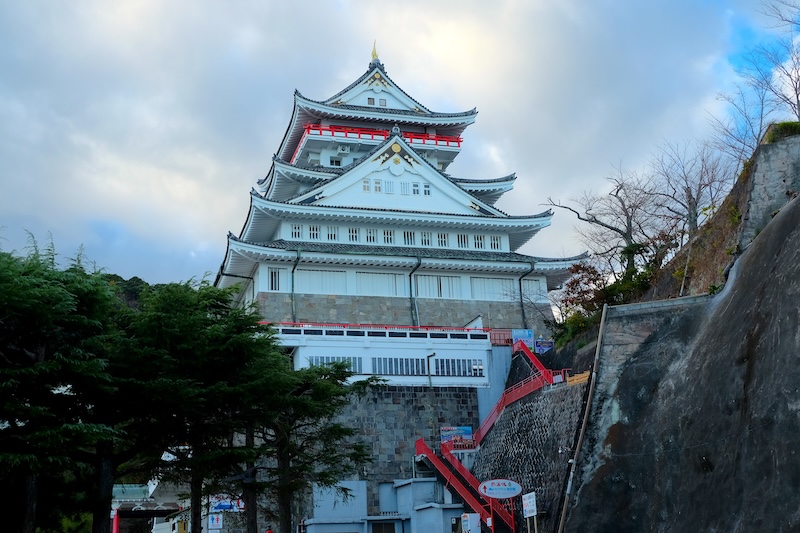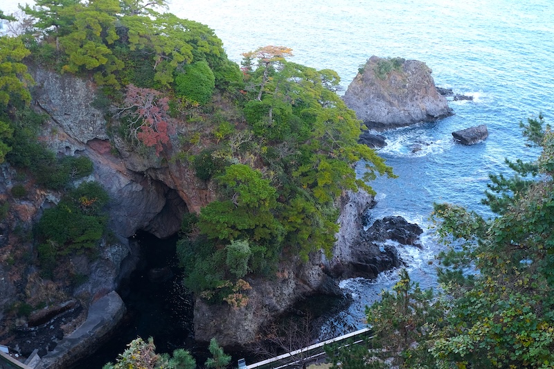 また、お城から下の海の方に走っていくと景勝地の錦ヶ浦があり、海原の眺望と共に素晴らしい景観を見ることができます。近くには秘宝館や明治43年開通の観魚洞隧道などもあるので興味のある方は立ち寄って見るのもありです。