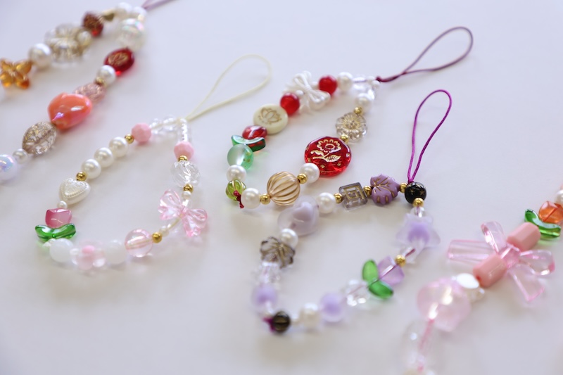 お好きなビーズを組み合わせてオリジナルストラップを作れます。チューリップ型やカラフルなお花、リボンなどさまざまな形のビーズをとりそろえています。