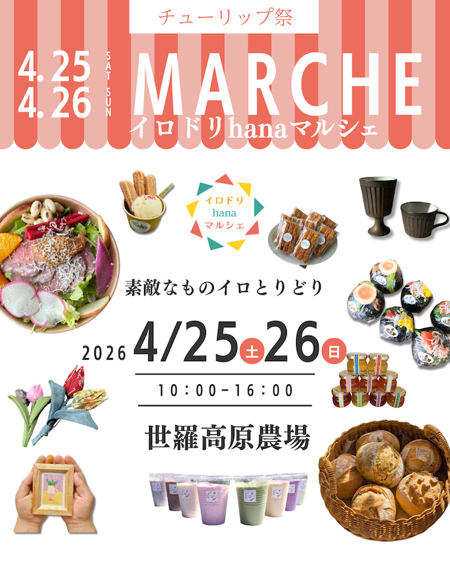 恒例となった花畑でのマルシェを今年も開催します。県内・近隣から美味しいもの、こだわりの雑貨、ワークショップなどが集まります。