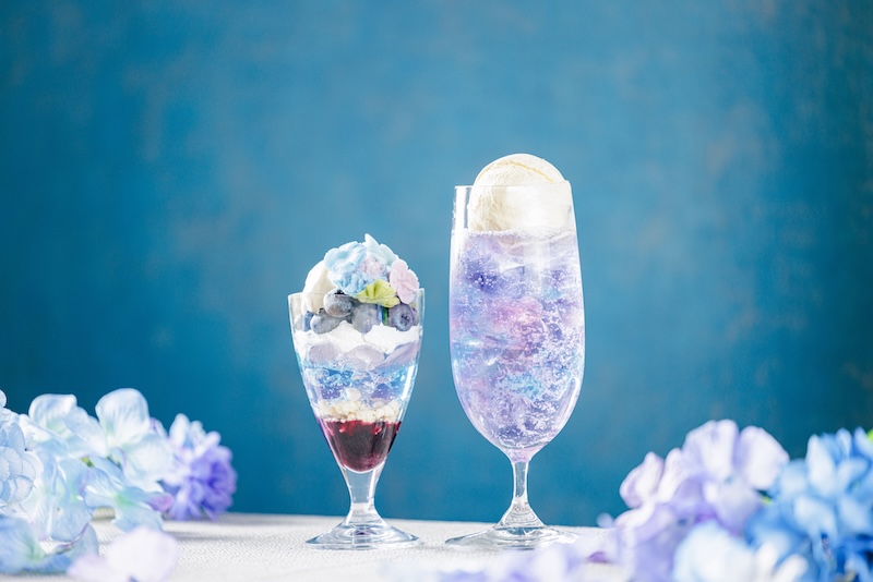 紫陽花をモチーフにした2種類のメニューが登場します。「紫陽花クリームソーダ」は、青から紫へのグラデーションが美しく、どこか懐かしさもあるドリンク。「紫陽花ミニパフェ」は、繊細な「あんフラワー」で紫陽花を表現した、写真に収めたくなる一品です。