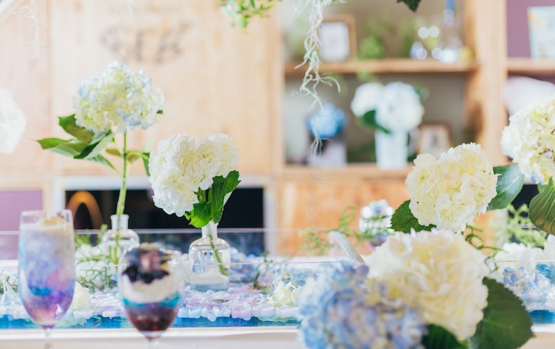 茨城県を代表する花の聖地「いばらきフラワーパーク」が空間演出を監修。「TAMARIBA」の棚やテーブルは色鮮やかな紫陽花で埋め尽くされ、一歩足を踏み入れるとそこはまるで庭園のような空間です。天候に左右されず、いつでも満開の紫陽花の写真を撮ったり、くつろいだりすることができます。