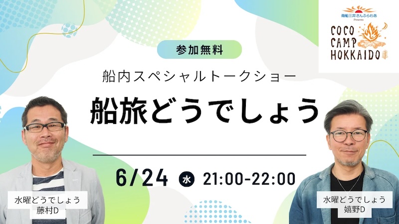 当社は、「ここキャン北海道」とのコラボレーション企画として、「水曜どうでしょう」を手掛ける藤村ディレクター、嬉野ディレクター、HTBマスコットキャラクター「onちゃん」が参加する船内イベントを実施。また、大洗~苫小牧航路をご利用の方に各キャンプ会場で「ここキャン」オリジナルグッズをプレゼントいたします。