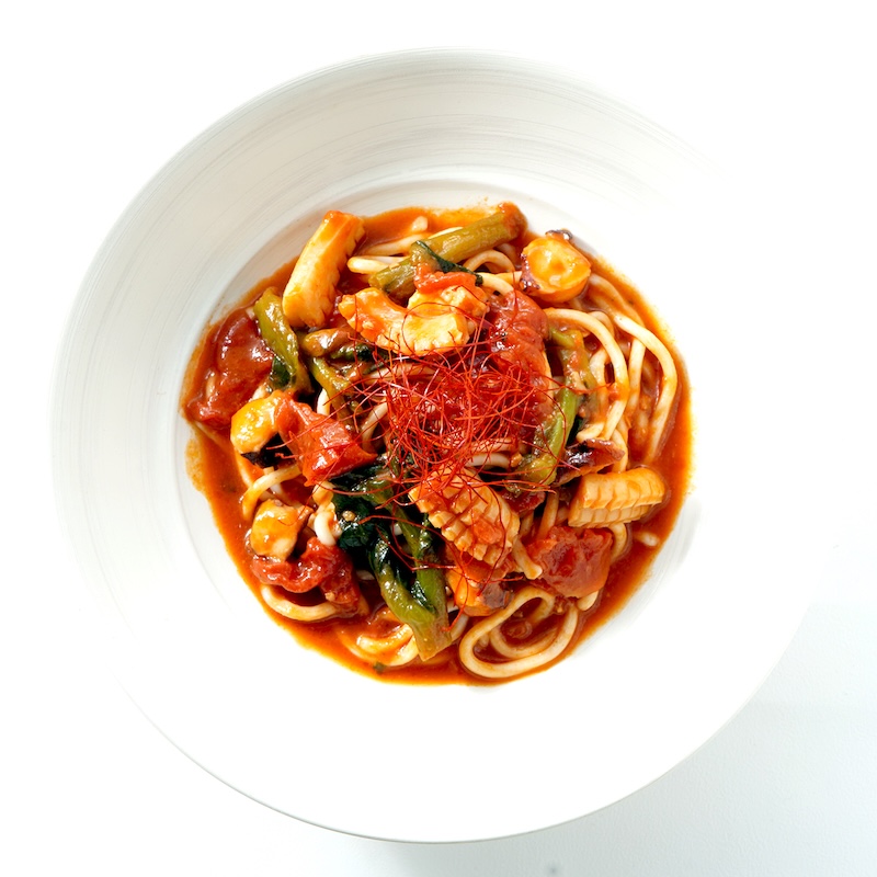 ぷりっとしたイカと旨味の濃いタコに、春を告げる菜の花を合わせ、にんにくと唐辛子で香り高く仕上げたガーリックチリパスタです。海鮮の旨味とオイルのコク、菜の花のほろ苦さが絶妙に重なり、春らしい軽さの中にしっかりとした満足感が広がる一皿です。