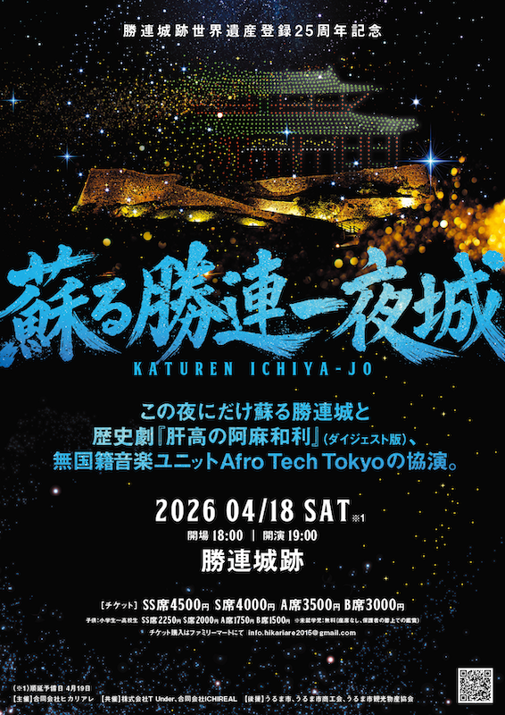 沖縄県うるま市の世界遺産・勝連城跡にて、500機のドローンによる光の演出と、沖縄の歴史を現代的に再構成した『歴史劇「肝高の阿麻和利」ダイジェスト版』を融合させたナイトエンターテイメントイベント『蘇る勝連一夜城(よみがえる かつれんいちやじょう)』を2026年4月18日(土)開催いたします。