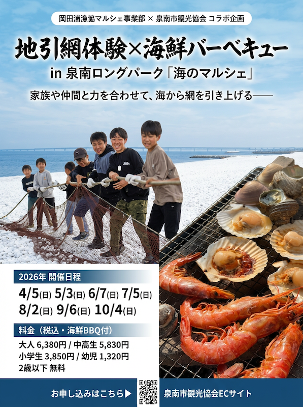 企画名:地引網体験×海鮮バーベキュー in 泉南ロングパーク「海のマルシェ」開催場所:泉南ロングパーク「海のマルシェ」前広場(マーブルビーチ隣接/泉南りんくう公園内)時間:9:30〜12:30(所要約3時間)定員:50名〜150名(150名に達し次第受付終了)雨天時:中止・返金対応