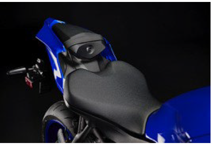 上体自由度をポイントに、新しいライディングポジションを設定。従来モデルに対しハンドル位置を3.6mm 上方/8.4mm 後方へ移設。また、燃料タンク形状の変更で前後方向への自由度も拡大させました。コーナーへの進入から旋回、切り返しといった場面で、積極的な体重移動を支えます。またフロントシートを新作。表皮のシボを「YZF-R1/R9」と共通にし、乗車感とグリップ力を向上。さらにシート高を従来モデル比で5mm 下げることで、足つき性の向上とアクセシブルな乗車姿勢を実現しました。