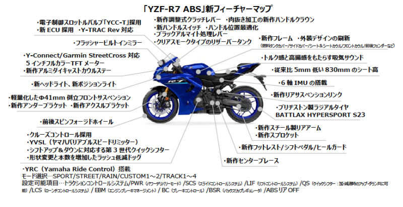 1)新採用の「YCC-T(電子制御スロットル)」や「6軸IMU(Inertial Measurement Unit)」との連動による、「YRC(Yamaha Ride Control)」、クルーズコントロールシステム、「YVSL(Yamaha variable speed limiter)」など、多彩なライダー走行支援システム