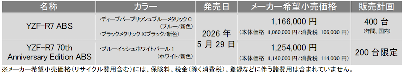 ヤマハ発動機販売株式会社は、“クロスプレーン・コンセプト※1”に基づく水冷・4ストローク・DOHC・直列2気筒・688cm.エンジンを搭載したスーパースポーツ「YZF-R7 ABS」をモデルチェンジし、5月29日に発売します※2。また、ヤマハ発動機創立70周年を記念する「70th Anniversary Edition」を200台限定で同日発売します。