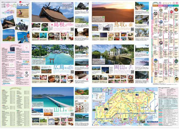 掲載内容は、広域観光案内図に加え、モデルコース、主要交通アクセス、各県のおすすめ観光情報、祭・イベント・花暦カレンダーなど、多角的に中国地域の魅力を伝える構成となっており、幅広い観光客の周遊促進に活用されます。