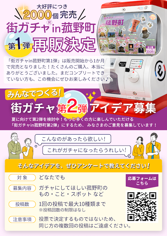 大好評につき販売1か月を待たずに完売したご当地カプセルトイ「街ガチャin菰野町」が、待望の販売再開!さらに、第2弾企画のアイデア募集も同時に始まります!あなたのアイデアがガチャガチャに!!