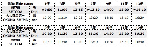 ●乗降場所:瀬戸田ビジター桟橋、大久野島第一桟橋