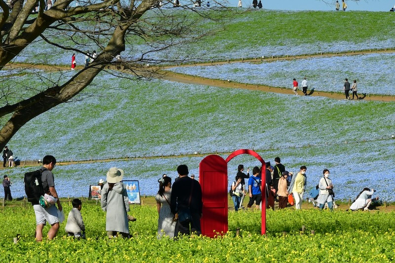 花々に囲まれた空間では、まるで扉から現れたかのような写真を撮影することができ、ご来園の記念撮影スポットとしてご利用いただけます。なお、赤い扉は昨年秋に初めて設置されたもので、ネモフィラの時期に登場するのは今回が初めてとなります。