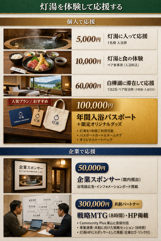 地域の事業者との共創や、施設を自分事として応援できるプランを用意しています。
