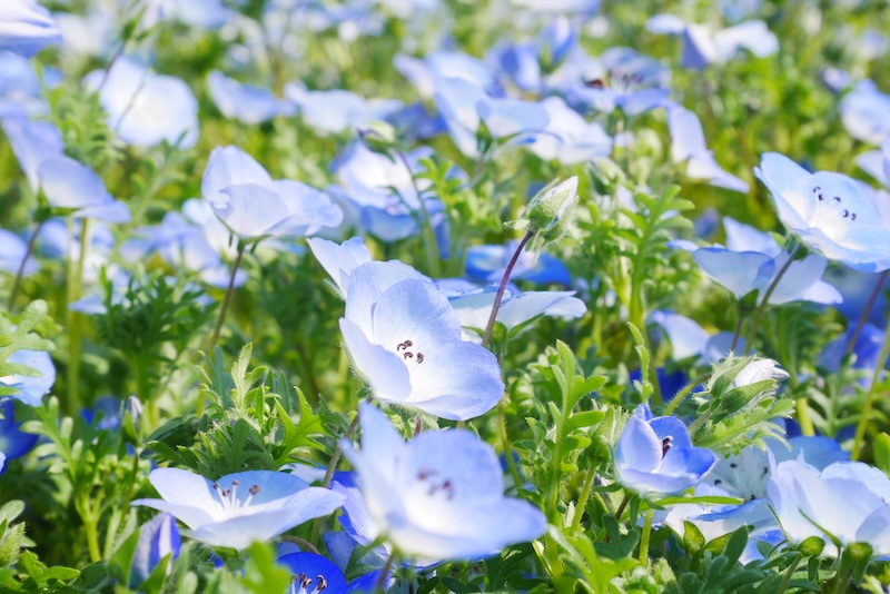 ネモフィラはムラサキ科(旧ハゼリソウ科)ネモフィラ属で、北アメリカ原産の一年草。高さ10~20cmほどの株に、直径2~3cmの小さな青い花を咲かせます。和名の「瑠璃唐草」は、瑠璃色の花と唐草模様に似た葉の形に由来。英名の「Baby blue eyes」は花の中心部が白く、小さくて愛らしい青い花の様子が、無垢で美しい赤ちゃんの青い瞳を連想させることに由来しています。