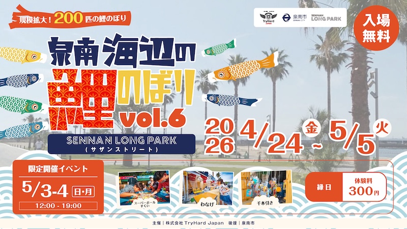 株式会社TryHard Japan(大阪市中央区)は、2026年4月24日(金)~5月5日(火・祝)にSENNAN LONG PARK(センナンロングパーク)にて、「泉南海辺の鯉のぼりvol.6」を開催することを発表いたします。