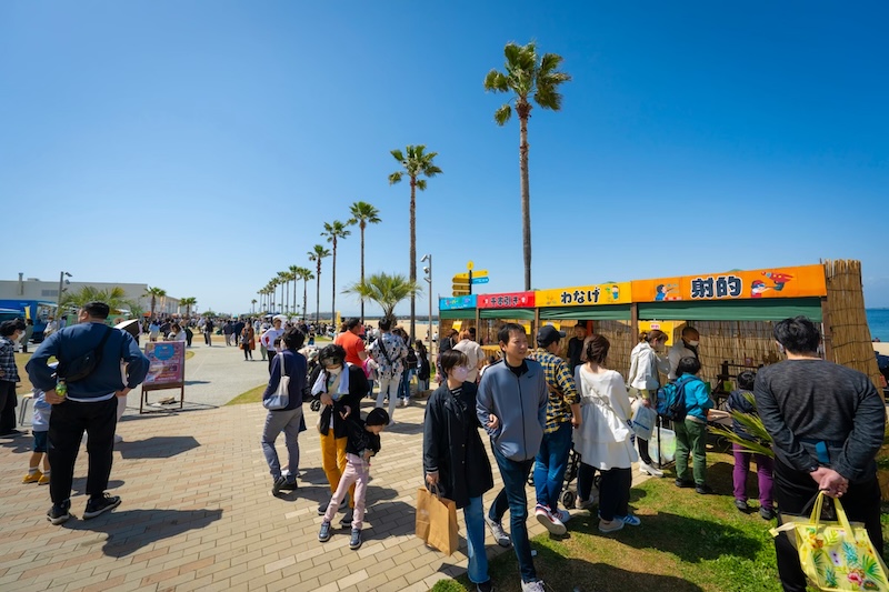 会場となる海辺エリア一帯には、色とりどりの鯉のぼり約200匹が空を彩り、空と海を背景にダイナミックな景観が広がります。春の風を受けて一斉に泳ぐ姿は迫力があり、訪れる方々に季節感あふれるひとときを提供します。