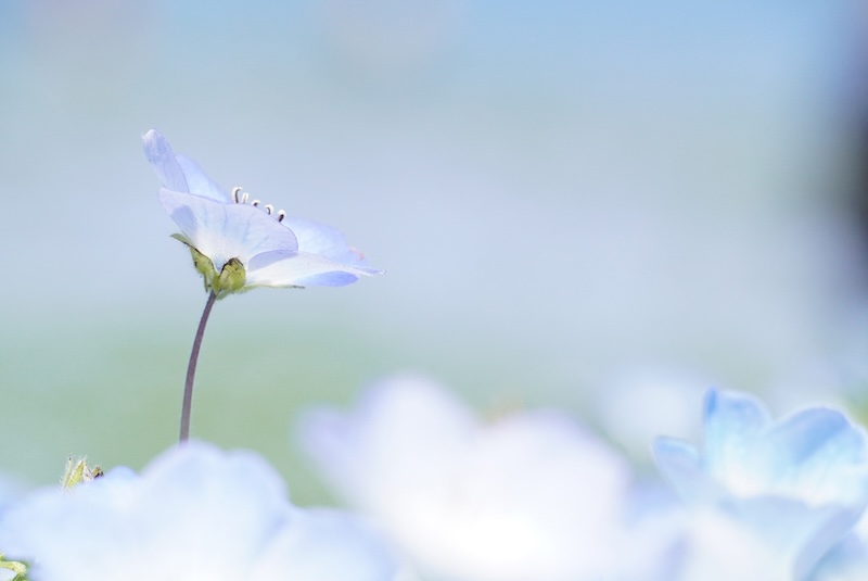 ネモフィラはムラサキ科(旧ハゼリソウ科)ネモフィラ属で、北アメリカ原産の一年草。高さ10~20cmほどの株に、直径2~3cmの小さな青い花を咲かせます。和名の「瑠璃唐草」は、瑠璃色の花と唐草模様に似た葉の形に由来。英名の「Baby blue eyes」は花の中心部が白く、小さくて愛らしい青い花の様子が、無垢で美しい赤ちゃんの青い瞳を連想させることに由来しています。