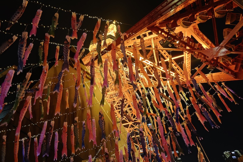 昼は青空とオレンジ色の東京タワーをバックに泳ぐ色とりどりの鯉のぼり。夜は東京タワーとともに鯉のぼりたちもライトアップ!