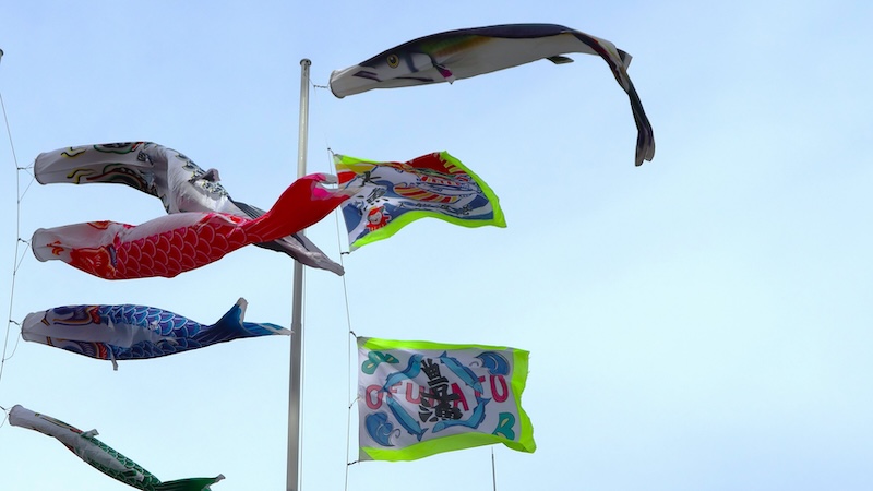 カラフルな鯉たちに混ざって、1匹だけ全長6mに及ぶ「さんまのぼり」が泳いでいます!