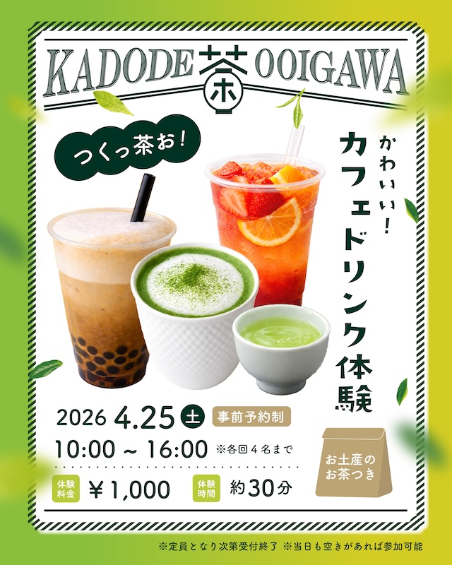 緑茶・農業・観光の体験型フードパーク「KADODE OOIGAWA(かどでおおいがわ)」では、毎年恒例となるお茶の祭典「茶フェス」を開催いたします。新茶の販売をはじめ、お茶を使用した限定グルメやスイーツ、さらにはお茶の魅力を体験できる多彩なイベントをご用意し、子どもから大人まで楽しめる“お茶づくし”のひとときをお届けします。