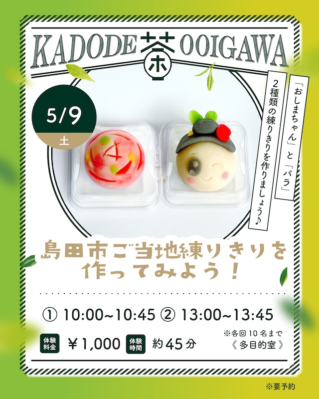 島田市の魅力がいっぱいつまったご当地練りきりをつくってみよう!作るのは、島田市のゆるキャラ「おしまちゃん」と、市の花である「バラ」の2種類。上手に作ることよりも「楽しむこと」を大切にしています。初めての方がほとんどなので、安心してご参加ください。