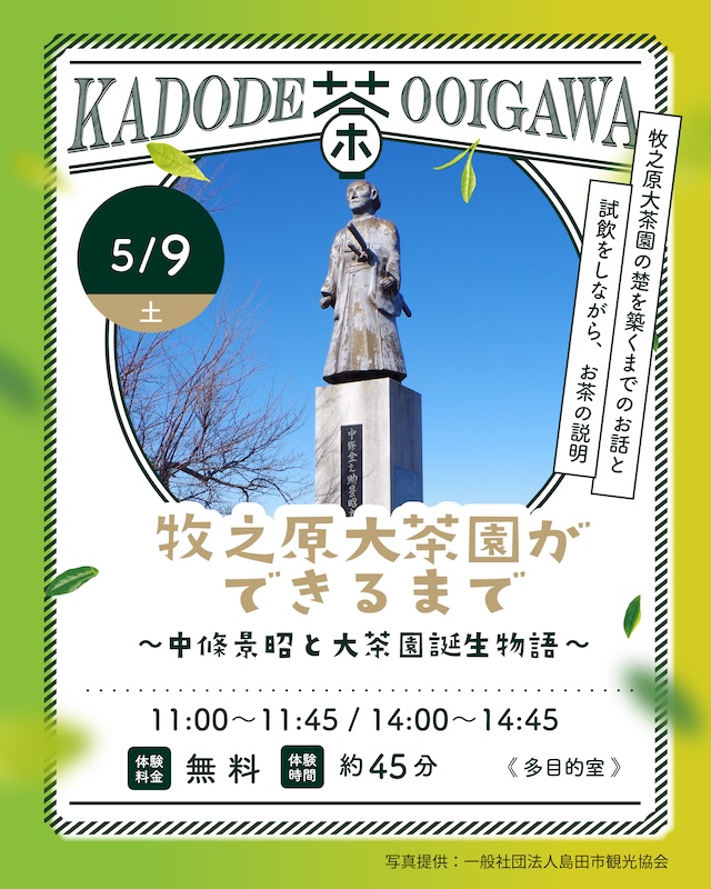 旧徳川家臣で刺客の中條景昭が、開墾団のリーダーとして牧之原大地を開墾し、現在の牧之原大茶園の礎を築くまでのお話。講演終了後には、牧之原大地のお茶を試飲していただきながら、お茶の種類や特徴について説明します。歴史のお話のあとに、実際のお茶の味わいもぜひお楽しみください。