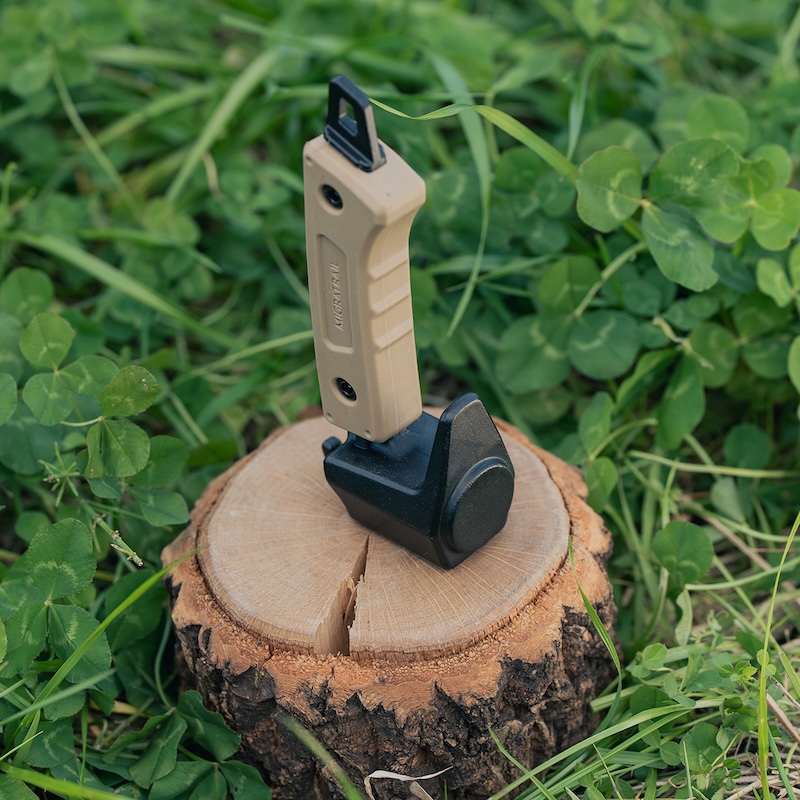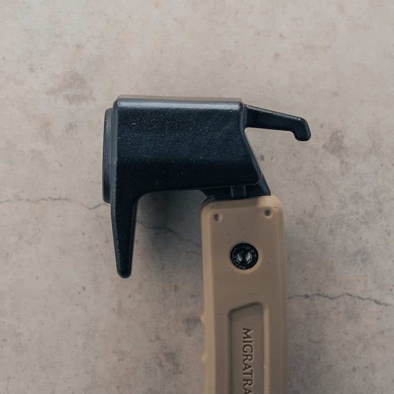 メインはフルタングのハンマーヘッドとグリップの2部品で構成されており、部品構成が少ないので破損のリスクや、長く使用している時に起こる各部のガタツキなどの心配がない。ペグを簡単に抜くことができる、ペグ抜きフックを装備。グリップエンドの穴に好みのパラコードを結べば、ハンガーフックにしたり、使用時の抜け防止のループとして使用できる。