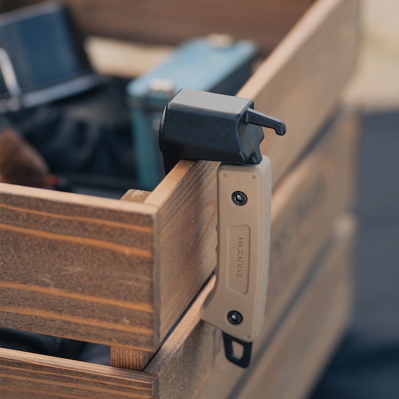 ハンマーヘッドのシールドデザインにより、テーブルなどに掛けることができる。地面ではなく目立つ場所に掛けておけば、コンパクトでもキャンプフィールドで見つけやすく紛失を防ぐ。