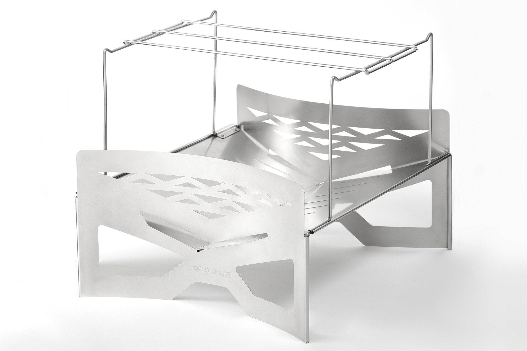 従来の軽量焚火台に比べ、 薪をストレスなく組めるよう火床の広さを十分に確保。 より燃焼効率が高まる「井桁型(いげたがた)」や美しい炎が鑑賞できる「合掌型(がっしょうがた)」など、 自由な組み方が楽しむことが可能。 薪を支える火床には3つの梁があり、 脚となるパーツを垂直荷重でしっかり支えるので、 安定感も抜群です。