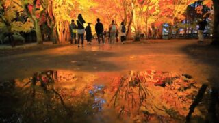 ライトアップと和紙製の行灯の暖かな光に包まれたカエデ園内では、色とりどりの葉が織りなす美しい風景に心が癒されること間違いなし。